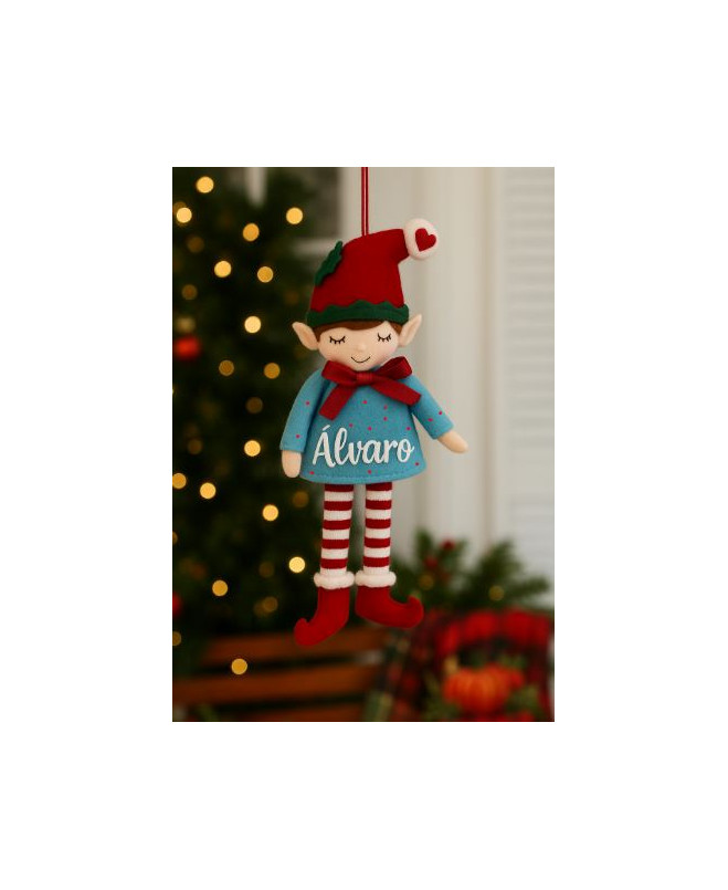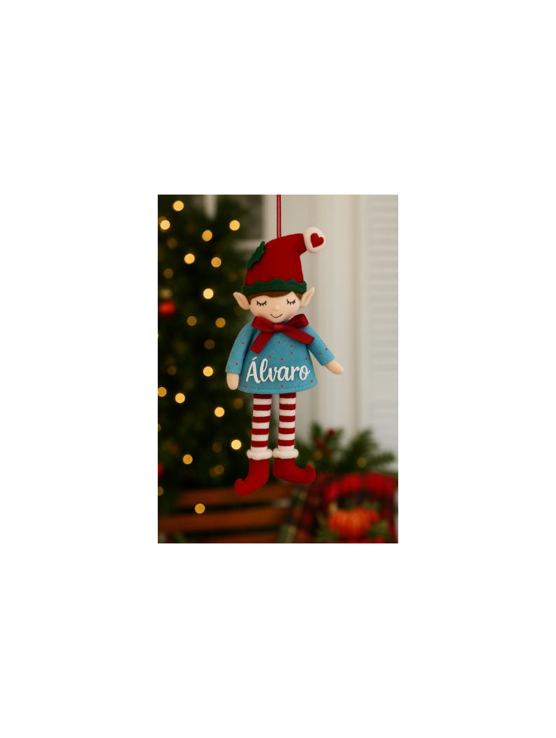 Este pequeño travieso está confeccionado con felpa suave y colores alegres , listo para colgarse en tu árbol y repartir buen humor. Su nombre en vinilo blanco aterciopelado le da el toque personalizado perfecto (porque, seamos honestos, ¡a los elfos también les gusta el protagonismo!).